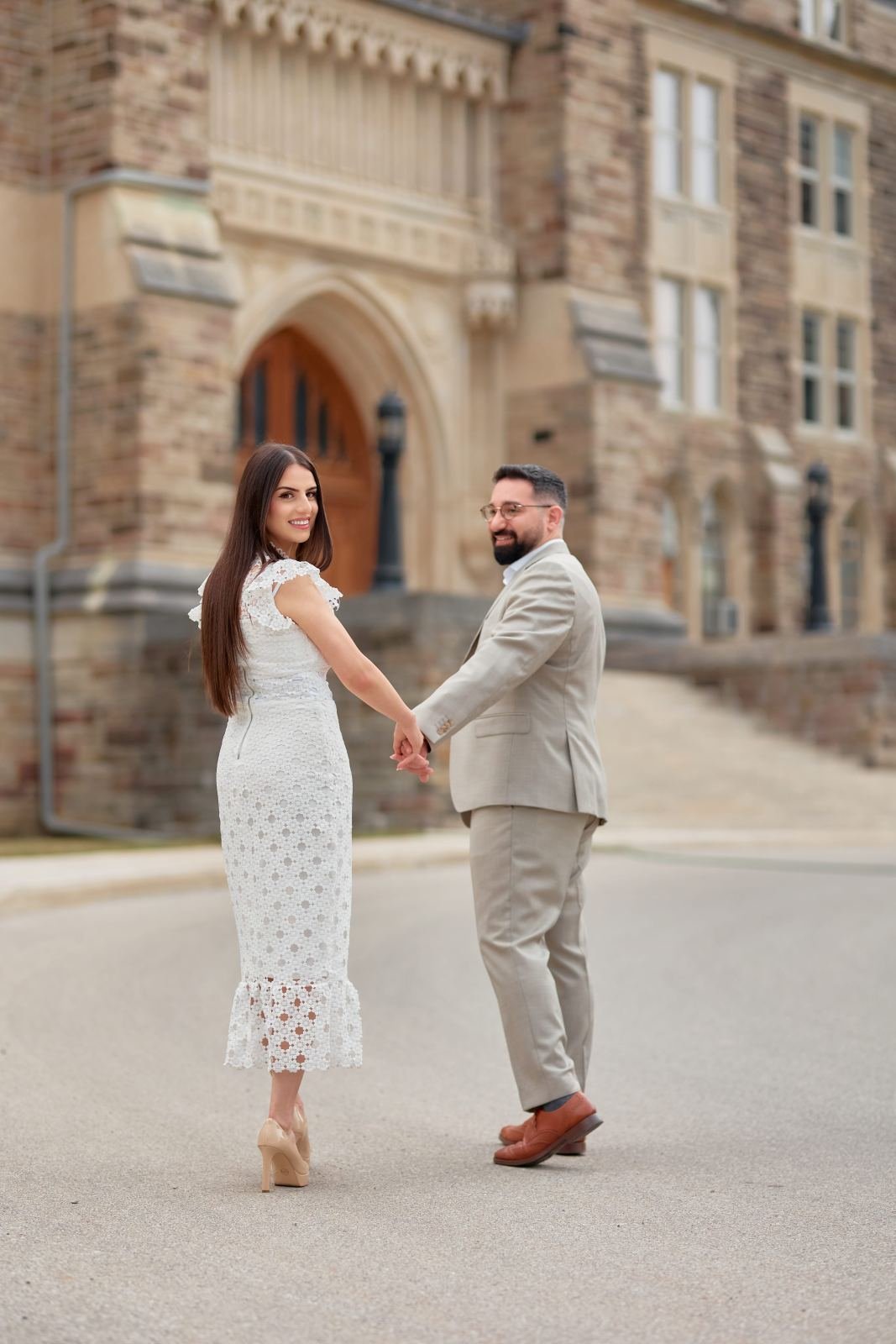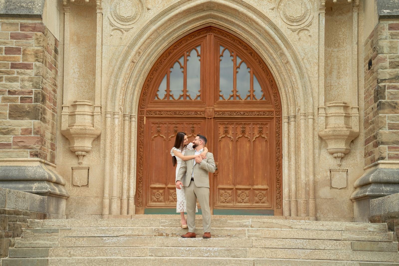 Their love found its backdrop against the solid foundations of a historic landmark. Standing before the grand, towering entrance, their pose signifies the strength and permanence of their bond—a relationship built to last, enduring like the stone around them. This is where their union gained its historical depth.